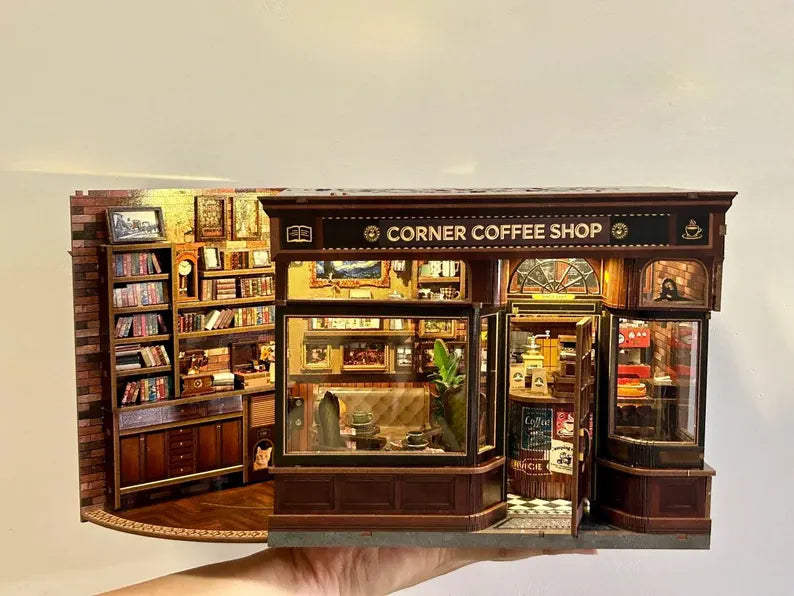 Wooden Craft Corner Coffee Shop House DIY Miniature Openable Side Door, Home Décor Birthday Christmas Gifts for Friends, and Families